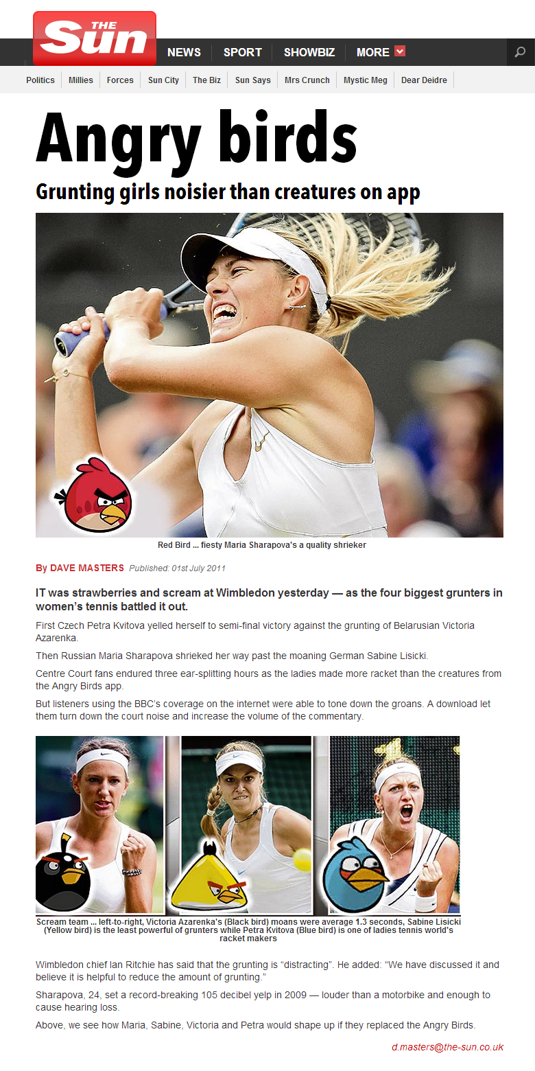 Interestingly, after releasing Angry Tennis Birds at the start of the 2011 Wimbledon championship and publicising it as much as I possibly could on twitter, facebook, and via friends, a week or so later an article appeared in the Sun newspaper titled "Angry Birds - Grunting girls noisier than creatures on app" :