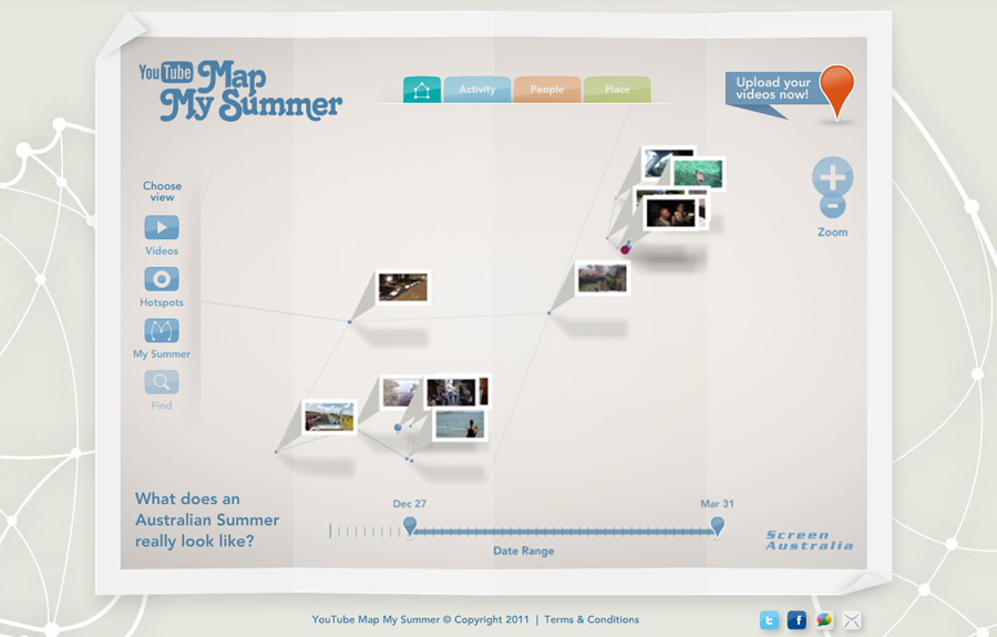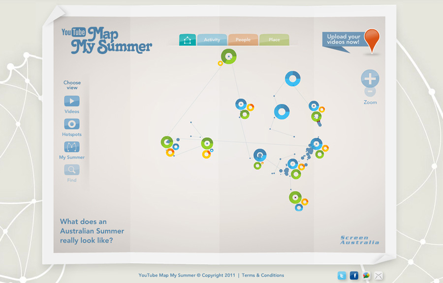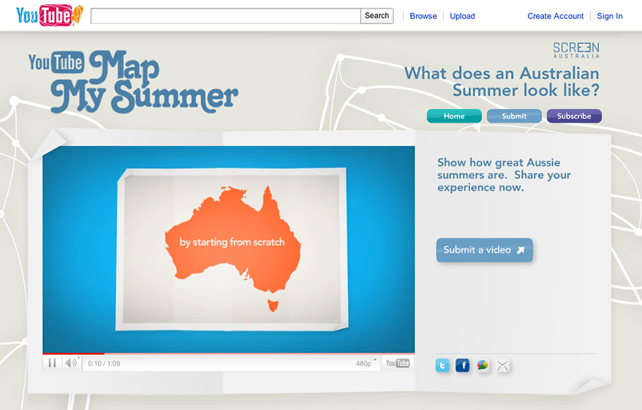 To find out what an Australian summer actually looked like, YouTube Australia invited the nation to remap Australia, using just their summer experiences. Every upload was geo-located using Google Maps technology to create the world’s first summer map. By the end of the campaign, YouTube Map My Summer had become a lasting visual archive of our summer in 2010-11, good and bad, for the whole world to see.